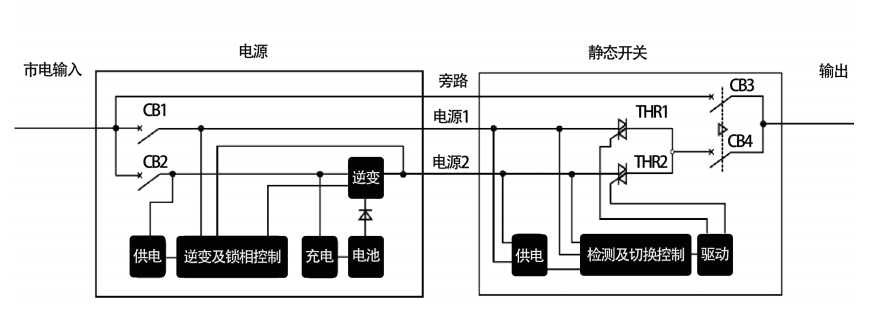 為了方便維護,系統內還設置有旁路開關,在檢修或系統故障時可以繼續向負載供電。